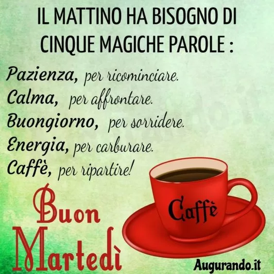 Gioia, Successi e Opportunità Buona giornata di martedì! Che questo giorno ti porti gioia, successi e tante occasioni positive. Affronta le sfide con determinazione e sii aperto alle opportunità. Che la tua giornata sia piena di sorrisi e soddisfazioni!
