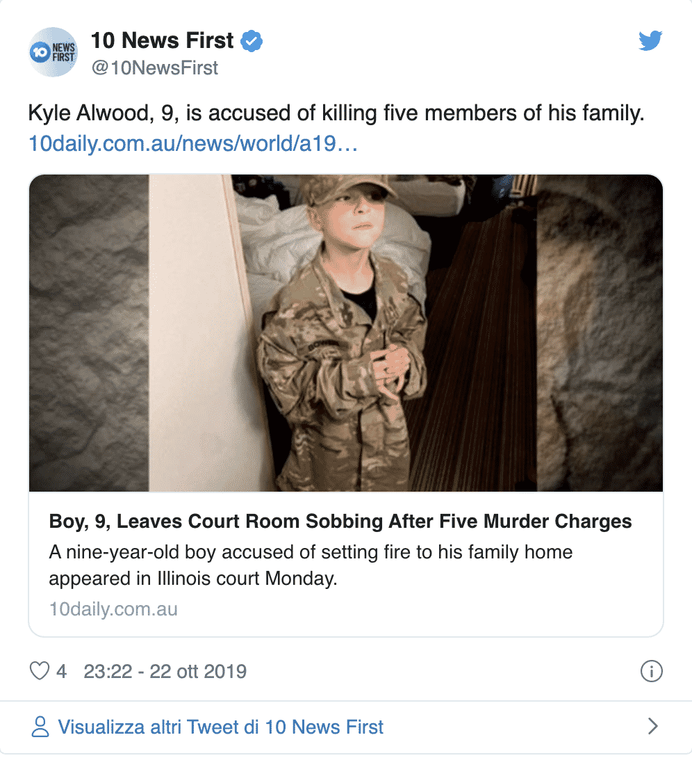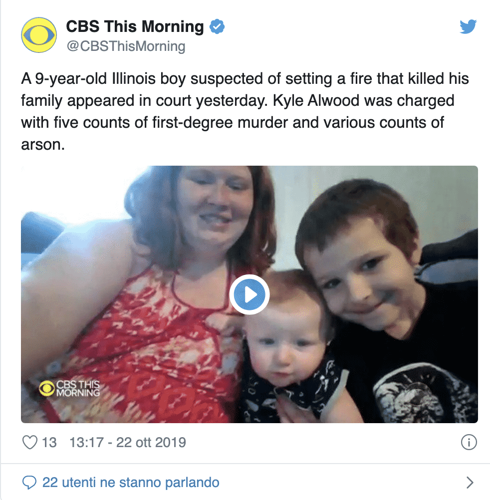 Un bambino di 9 anni pare che sia stato accusato di 5 omicidi di primo grado e anche di tanti altri episodi di incendio doloso in seguito alla morte di cinque membri della sua famiglia. Stando a quanto riferito sembrerebbe che i pubblici ministeri di un’audizione presso il Tribunale del circuito della contea di Woodford, abbia dichiarato il bambino di 9 anni di nome Kyle Alwood dell’Illinois colpevole di avere dato intenzionalmente fuoco alla casa della sua famiglia causando la morte di 5 persone. L’incendio in questione sarebbe avvenuto nella residenza di Timberline Mobile Home Park ed avrebbe ucciso due fratellastri del bambino, Ariel di un anno e Daemon di due anni, così come purtroppo anche il cugino dei due Ross Alwood.