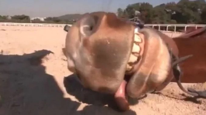 Jingang, un cavallo cinese, ha escogitato un modo divertente per impedire alle persone di cavalcarlo: finge di essere ‘morto’ ogni volta che qualcuno cerca di raggiungerlo. Pertanto, ogni volta che qualcuno cerca di salire in sella, l’animale si getta a terra, rimane fermo e riesce persino a lasciare gli zoccoli in aria e ad allungare la lingua, oltre a tirare fuori la lingua e alza gli occhi al cielo per fingere ancora di più. Insomma, un vero premio Oscar per uno degli spettacoli peggiori.