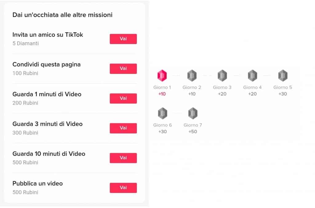 Questo programma referral prevede la fruizione di ben 10 rubini già nel momento del primo accesso, poi invitando gli amici ad iscriversi vengono regalati altri diamanti che ovviamente valgono più delle gemme date effettuando il login. Per poter guadagnare del vero denaro, bisognerà però svolgere delle missioni. In cosa consistono? Ad esempio si dovrà guardare 3 minuti di video, leggere il regolamento, pubblicare un video. In questo modo è possibile guadagnare dai 5 ai 500 rubini. Il saldo si andrà accumulando e poi si potrà trasferire su PayPal come vero denaro, in tagli da 2, 5, 20 e 30 euro.