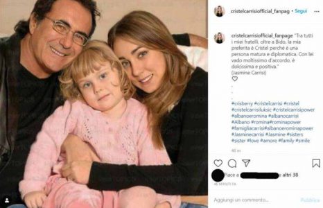“Tra tutti i miei fratelli, oltre a Bido, la mia preferita è Cristel perché è una persona matura e diplomatica. Con lei vado moltissimo d’accordo, è dolcissima e positiva“, ha ammesso Jasmine Carrisi. Tale foto e citazione è stata riportata da una nota fanpage della figlia di Al Bano. Nello scatto in questione, si vede la cantante da bambina, in braccio alla sorella Cristel, con accanto il suo papà Al Bano. Continua dopo la foto