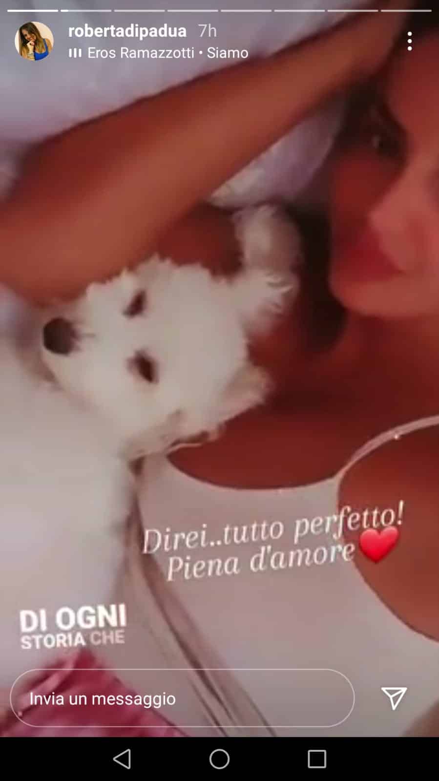 Sembra proprio che Roberta Di Padua abbia dato un po’ di serenità al suo cuore. Da tempo sofferente e randagio. Ed è stata proprio la donna , seguitissima sui social a comunicarlo ai fan. È bastato uno scatto per chiarire tutto. La dichiarazione d’amore che Roberta di Padua ha postato sui social era in realtà indirizzata al suo cucciolo . Infatti nello scatto la donna è ritratta con accanto il suo cagnolino bianco. Tenerezza e coccole sono ciò di cui ha bisogno la dama in questo preciso momento della sua vita. Oggi non le manca di certo l’amore e la tranquillità, a dichiararlo è stata proprio lei. A tal riguardo la Bella di Padua scrive : “Direi tutto perfetto, piena d’amore!”.