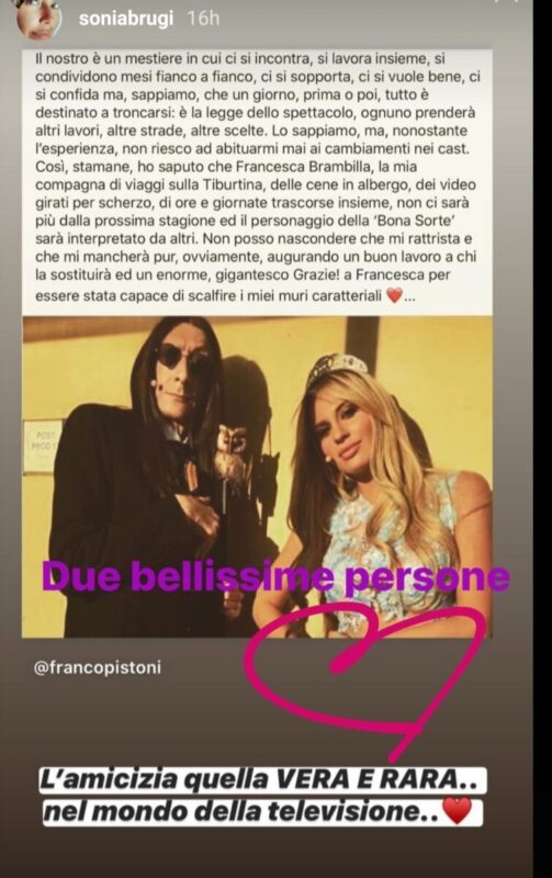 Non a caso, ecco che la moglie di Paolo Bonolis parla di vera amicizia tra i due mentre lo Iettatore parlando della collega scrive: “Così, stamane, ho saputo che Francesca Brambilla, la mia compagna di viaggi sulla Tiburtina, delle cene in albergo, dei video girati per scherzo, di ore e giornate trascorse insieme, non ci sarà più dalla prossima stagione ed il personaggio della ‘Bona Sorte’ sarà interpretato da altri. Non posso nascondere che mi rattrista e che mi mancherà pur, ovviamente, augurando un buon lavoro a chi la sostituirà ed un enorme, gigantesco Grazie! a Francesca per essere stata capace di scalfire i miei muri caratteriali…”.