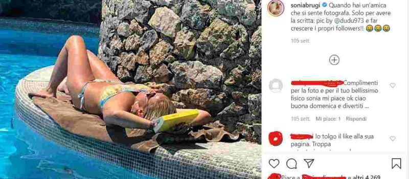 In questo scatto Sonia appare in costume da bagno, sdraiata su un asciugamano marroncino chiaro, con addosso un bikini molto colorato e gli slip a vita bassa dotati di laccetti. In questo scatto i capelli biondi della donna sono raccolti e indossa un paio di occhiali da sole che nascondono i suoi occhi. Sonia Bruganelli in questo scatto tiene in mano un libro a dimostrazione del fatto che lei ami leggere.