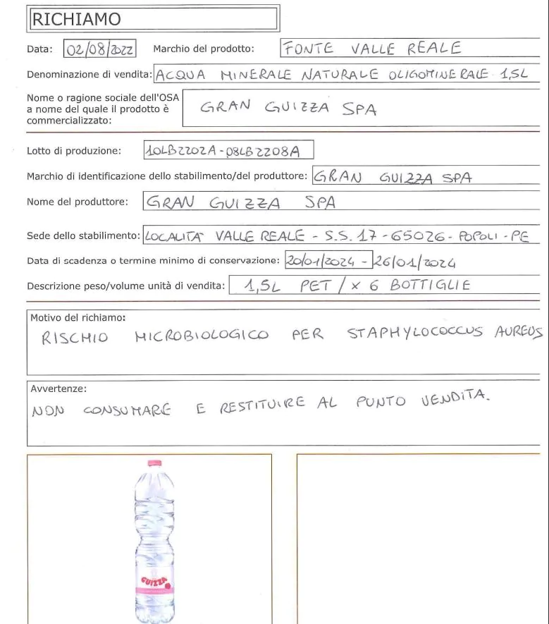 Il Ministero della Salute ha ordinato il ritiro di Acqua Guizza dagli scaffali dei supermercati a causa di un possibile rischio microbiologico per i consumatori dovuto alla causa da Staphylococcus. Il richiamo è stato disposto dal produttore dopo che le analisi a campione dello stato di produzione hanno rilevato la presenza di stabilimento da Staphylococcus aureus in alcuni prodotti finiti.