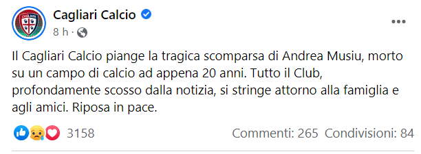 Dopo la partita, il giocatore si è accasciato a terra. Sul posto sono arrivate due ambulanze del 118, ma tutti i tentativi di salvare il giovane Andrea si sono rivelati inutili. Chi lo conosceva descrive Musiu come un ragazzo gentile ed educato, oltre che un apprezzato calciatore. “Il Cagliari Calcio piange la tragica scomparsa di Andrea Musiu”, si legge in un messaggio sui social convidiso dalla società rossoblù.