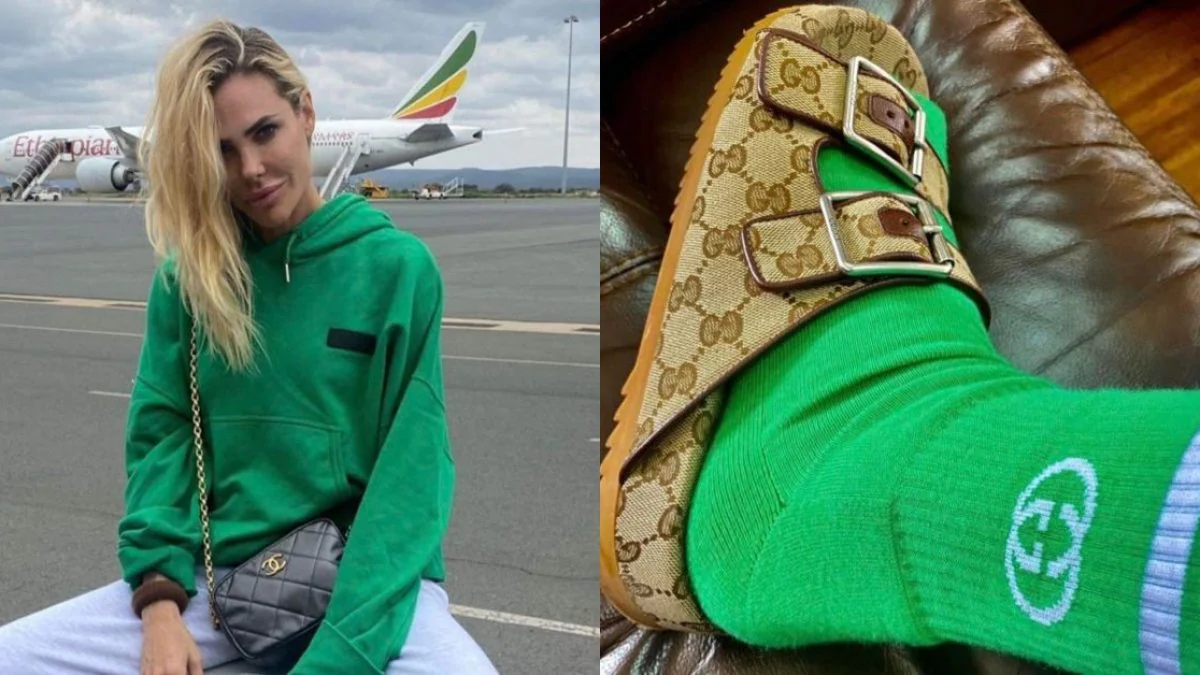 Oltre a portare la classica tracolla in pelle trapuntata di Chanel, ha seguito anche la tanto discussa tendenza delle pantofole a calzino. Ha abbinato i sandali a doppio cinturino di Gucci, ricoperti dall’iconico logo GG (a partire da 590 euro), a un paio di calzini verdi e bianchi Adidas x Gucci (150 euro). Ilary ha iniziato la sua nuova vita con capelli scompigliati, carnagione color acqua e una grande borsa.