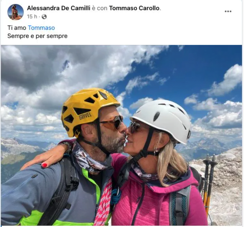 Alessandra De Camilli è sopravvissuta alla tragedia della Marmolada grazie a Tommaso Carollo, una delle vittime identificate. Su Facebook, la foto di un bacio e di un addio recita: “Ti amo per sempre”.