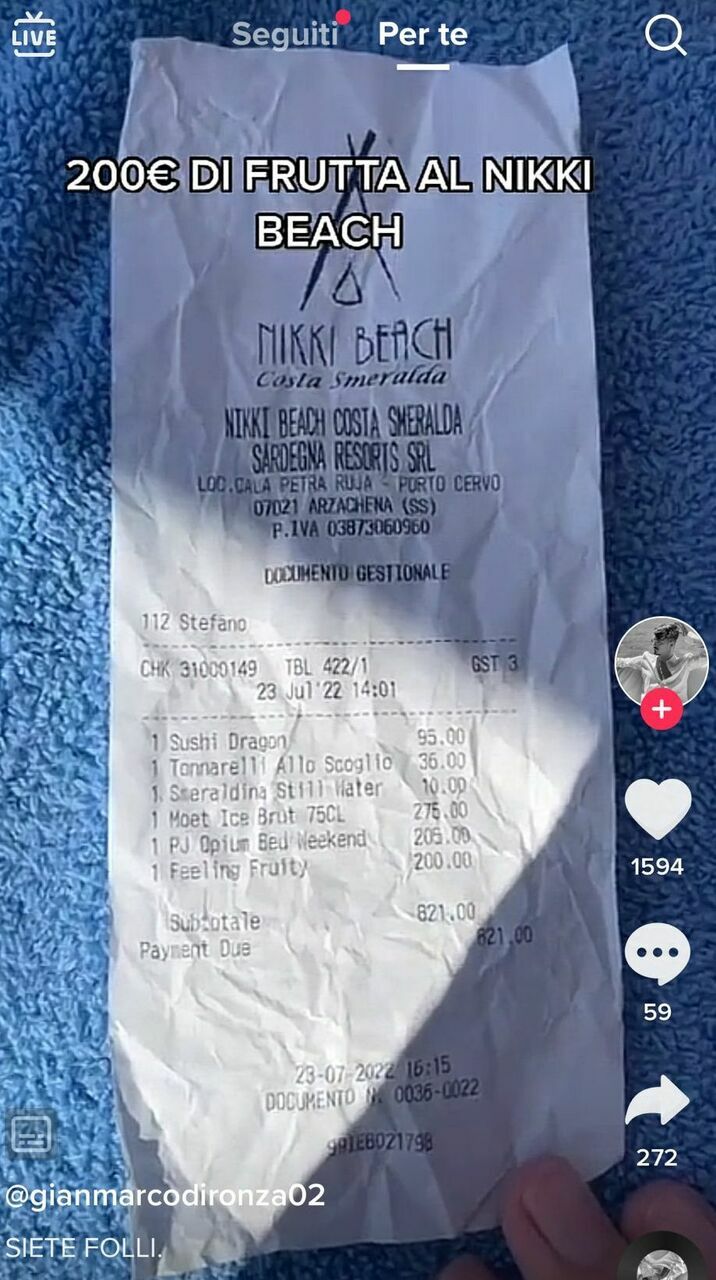 Gianmarco Di Ronza ha pubblicato un video su TikTok in cui mostra la sua insoddisfazione per il costo di un conto al Nikki Beach di Porto Cervo. Nel video, Di Ronza racconta di aver fatto colazione per 78 euro, ma di essere rimasto scioccato quando ha ricevuto il conto di 821 euro – e ciò che lo ha fatto arrabbiare di più è che il cesto di aveva frutta un prezzo di 200 euro.