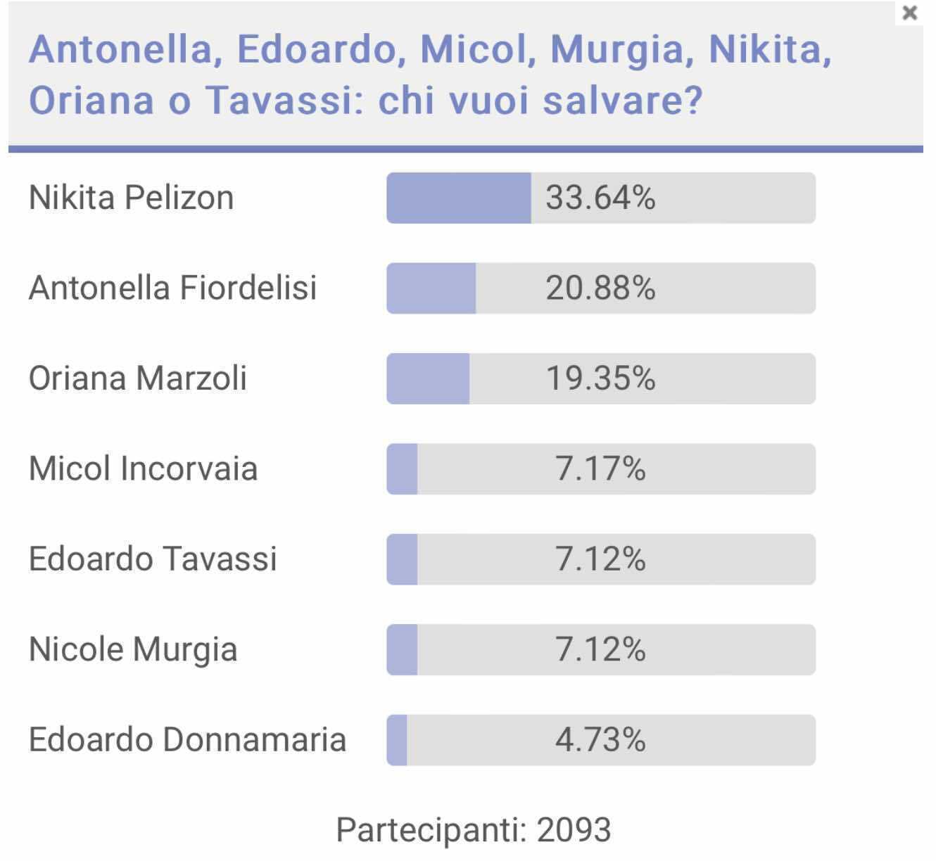 Chi rischia l’eliminazione? Non ce lo saremmo mai aspettato, ma sembra che Edoardo Donnamaria sia in fondo ai sette vipponi al televoto e rischi seriamente di lasciare per sempre la casa del Grande Fratello Vip. Certo, l’esito del televoto potrebbe non coincidere con quello dei sondaggi sul web, ma dalla foto che pubblichiamo qui sotto è chiaro che c’è il rischio che uno dei Donnamaria se ne vada!