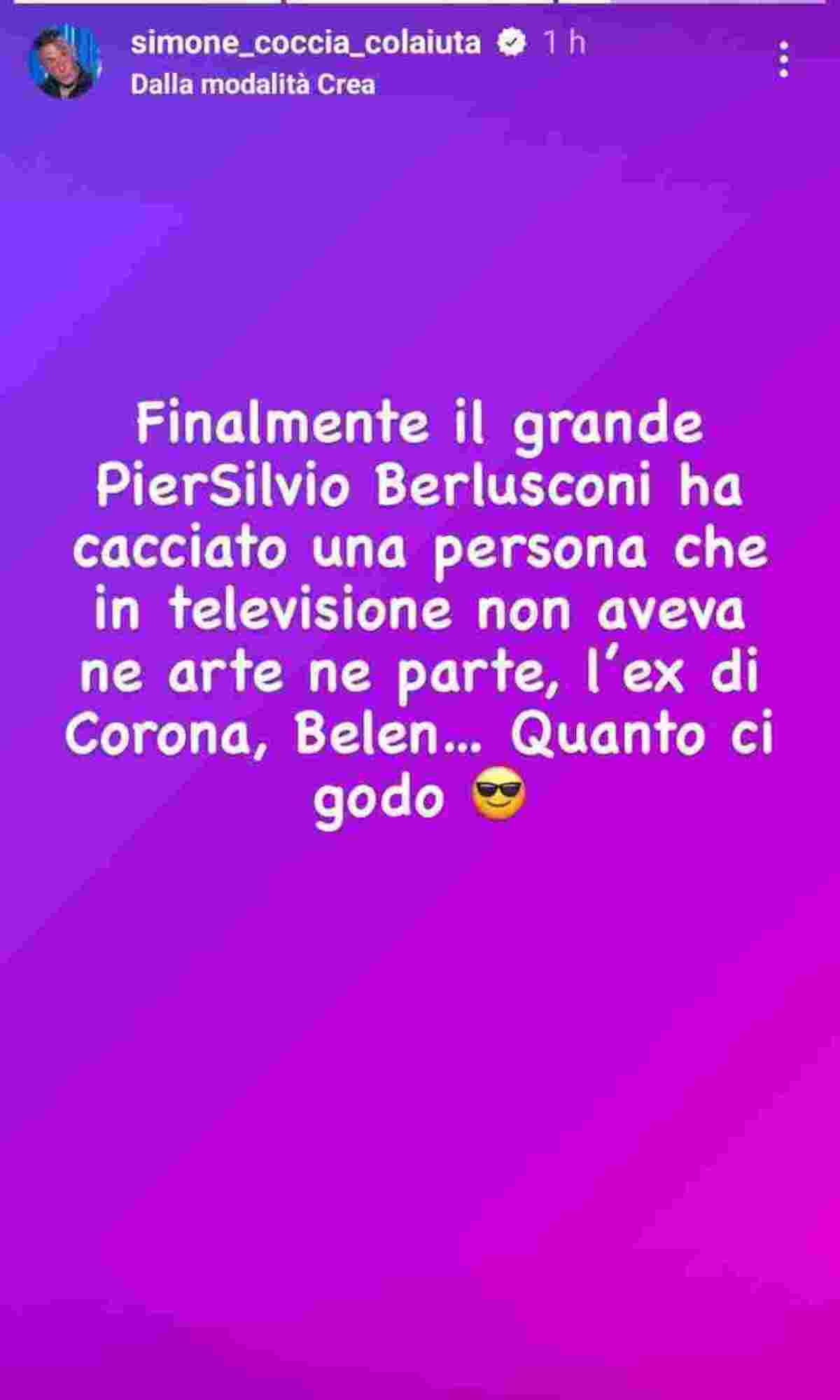 Non tutti, però, hanno salutato con rammarico l’addio di Belen a Mediaset. Simone Coccia Colaiuta, ex compagno di Stefania Pezzopane ed ex concorrente del Grande Fratello, ha postato un messaggio molto controverso sui social media. “Finalmente il grande Pier Silvio Berlusconi ha cacciato una persona che in televisione non aveva né arte né parte, l’ex di Corona, Belen… quanto ci godo”, ha scritto l’ex Grande Fratello. Numerosi utenti dei social media hanno criticato Simone Coccia Colaiuta, accusandolo di aver vissuto di rendita grazie alla sua relazione con Stefania Pezzopane e di essere noto solo per la sua partecipazione al Grande Fratello.