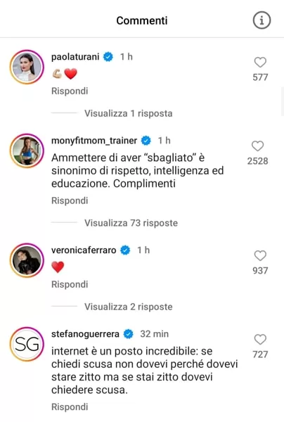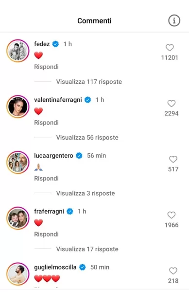 Anche la madre di Chiara, Marina Di Guardo, ha mostrato il suo amore e la sua vicinanza alla figlia con un cuore. Lo stesso gesto è stato compiuto da Fedez, il marito di Chiara Ferragni, e dalle sue sorelle Valentina e Francesca.