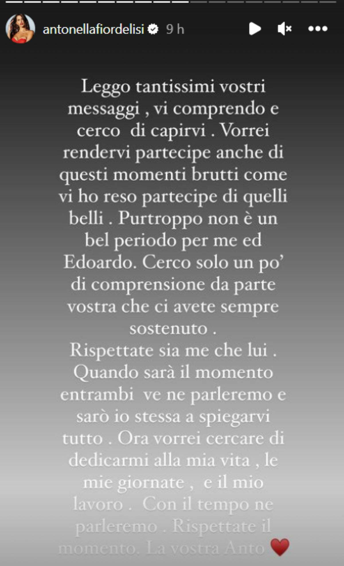 Antonella ha poi invitato tutti ad avere rispetto e ha annunciato i suoi attuali obiettivi personali. Ha chiesto comprensione per il momento difficile che sta attraversando sia lei che Edoardo, e ha sottolineato l’importanza di rispettare entrambi. Ha promesso che, quando sarà il momento opportuno, parleranno apertamente della situazione e sarà lei stessa a spiegare tutto.