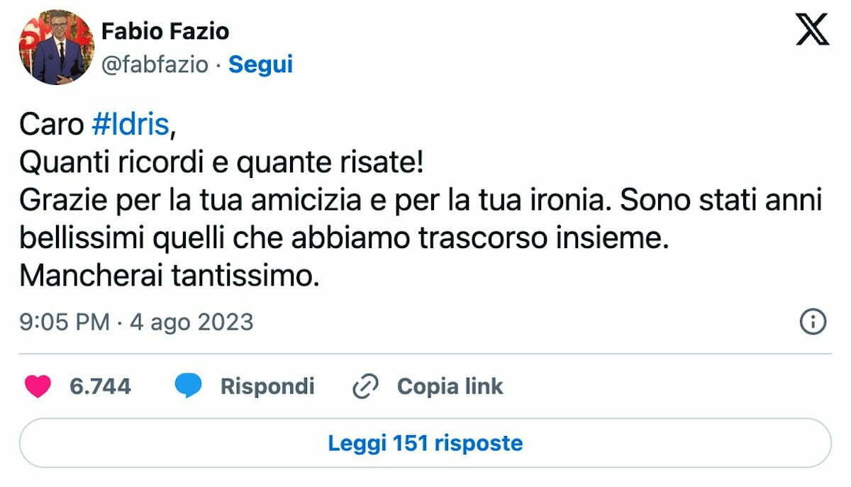 Su Twitter, Fabio ha condiviso un messaggio toccante: “Caro Idris, quanti ricordi e quante risate. Grazie per la tua amicizia e per la tua ironia. Sono stati anni bellissimi quelli che abbiamo trascorso insieme. Mancherai tantissimo”. Un omaggio sincero e sentito a una persona che ha condiviso con lui momenti indimenticabili a “Quelli che il calcio”. Su Instagram, la stessa foto accompagnava parole altrettanto commoventi.