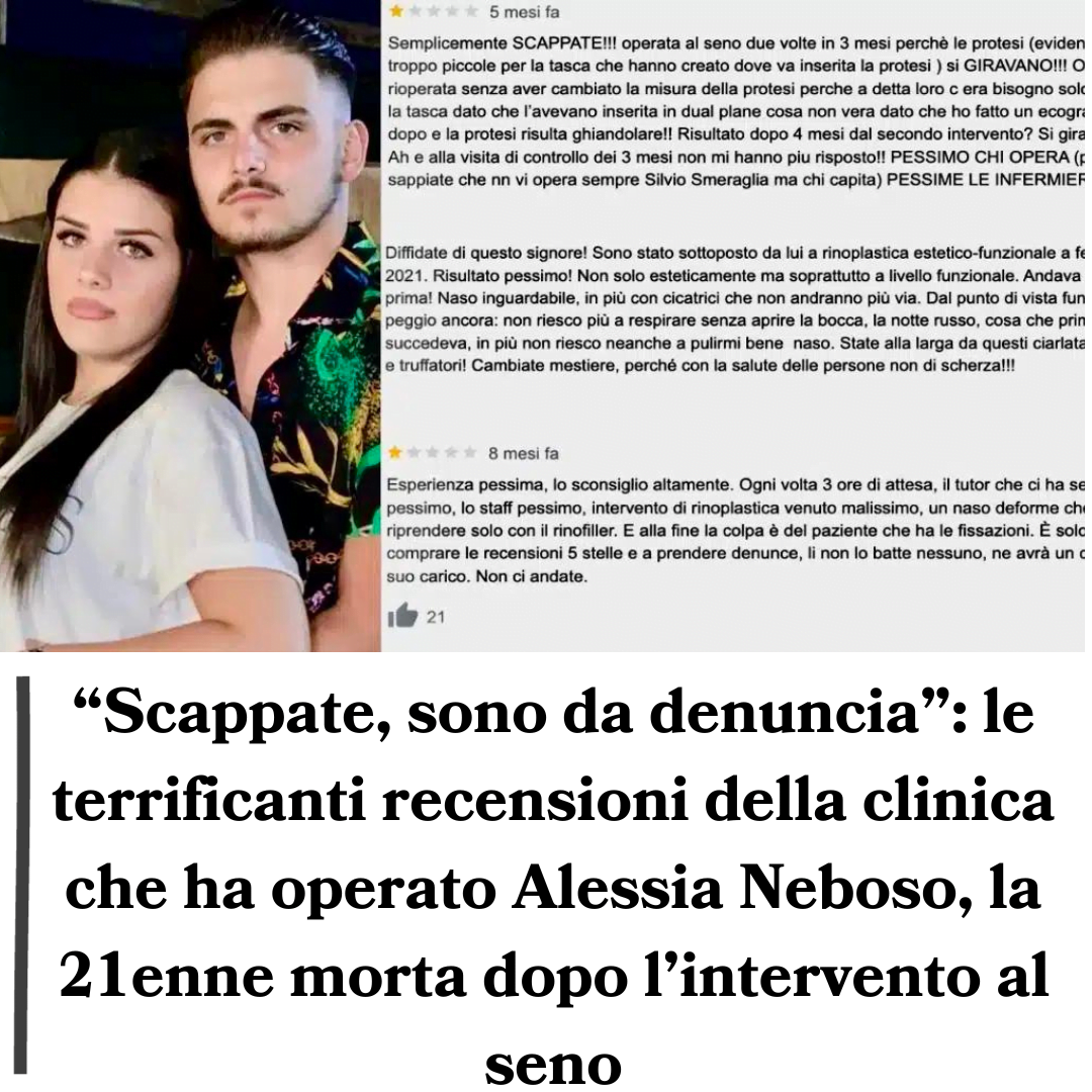 Nonostante le parole del legale, il web è affollato di recensioni negative riguardanti le operazioni svolte nella clinica in cui Alessia Neboso è stata trattata. Molti pazienti mettono in discussione l’operato del chirurgo e le pratiche della struttura. Una testimonianza racconta di un’operazione ripetuta a causa del cattivo posizionamento delle protesi, mentre un altro paziente lamenta risultati estetici e funzionali deludenti dopo un intervento di rinoplastica.