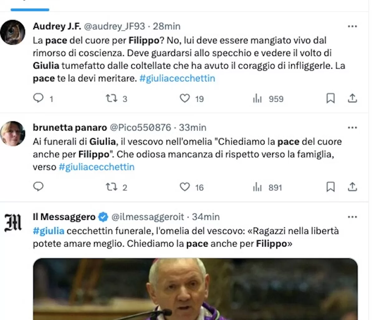 Su Twitter, molte persone hanno criticato aspramente il passaggio dell’omelia che chiedeva “pace del cuore per Filippo.” Alcuni utenti hanno dichiarato che questa richiesta rappresentava una mancanza di rispetto nei confronti di Giulia e della sua famiglia.