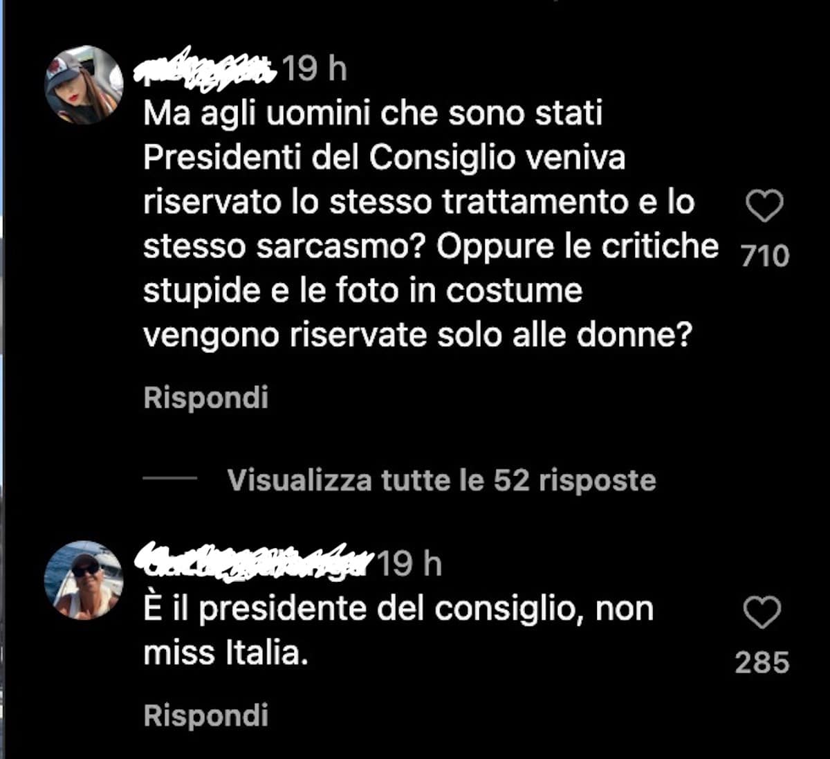 Alcuni commentatori si chiedono se gli uomini che hanno ricoperto la carica di Presidente del Consiglio siano stati oggetto dello stesso trattamento e del sarcasmo simile. Si solleva la questione delle critiche e delle foto in costume riservate principalmente alle donne. Alcuni condannano Roberto D’Agostino per aver pubblicato la foto, considerandola mancanza di rispetto.