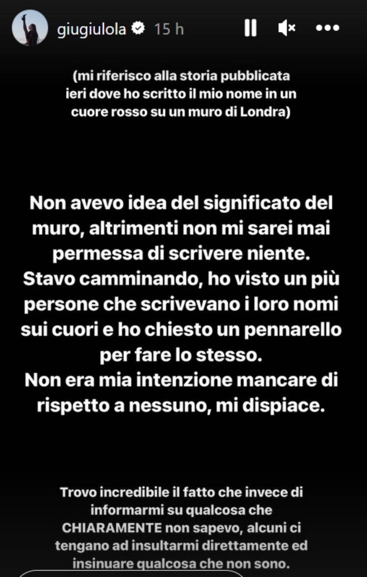Dopo 24 ore dalla pubblicazione della storia, Giulia Stabile si è resa conto dell’errore commesso e ha prontamente chiesto scusa. Ha dichiarato di non essere stata consapevole del significato del muro e di non voler mancare di rispetto a nessuno. Ha sottolineato la sorpresa nel vedere alcuni fan insultarla direttamente senza cercare di comprendere le sue intenzioni. Nonostante le scuse, le polemiche non si sono placate del tutto.