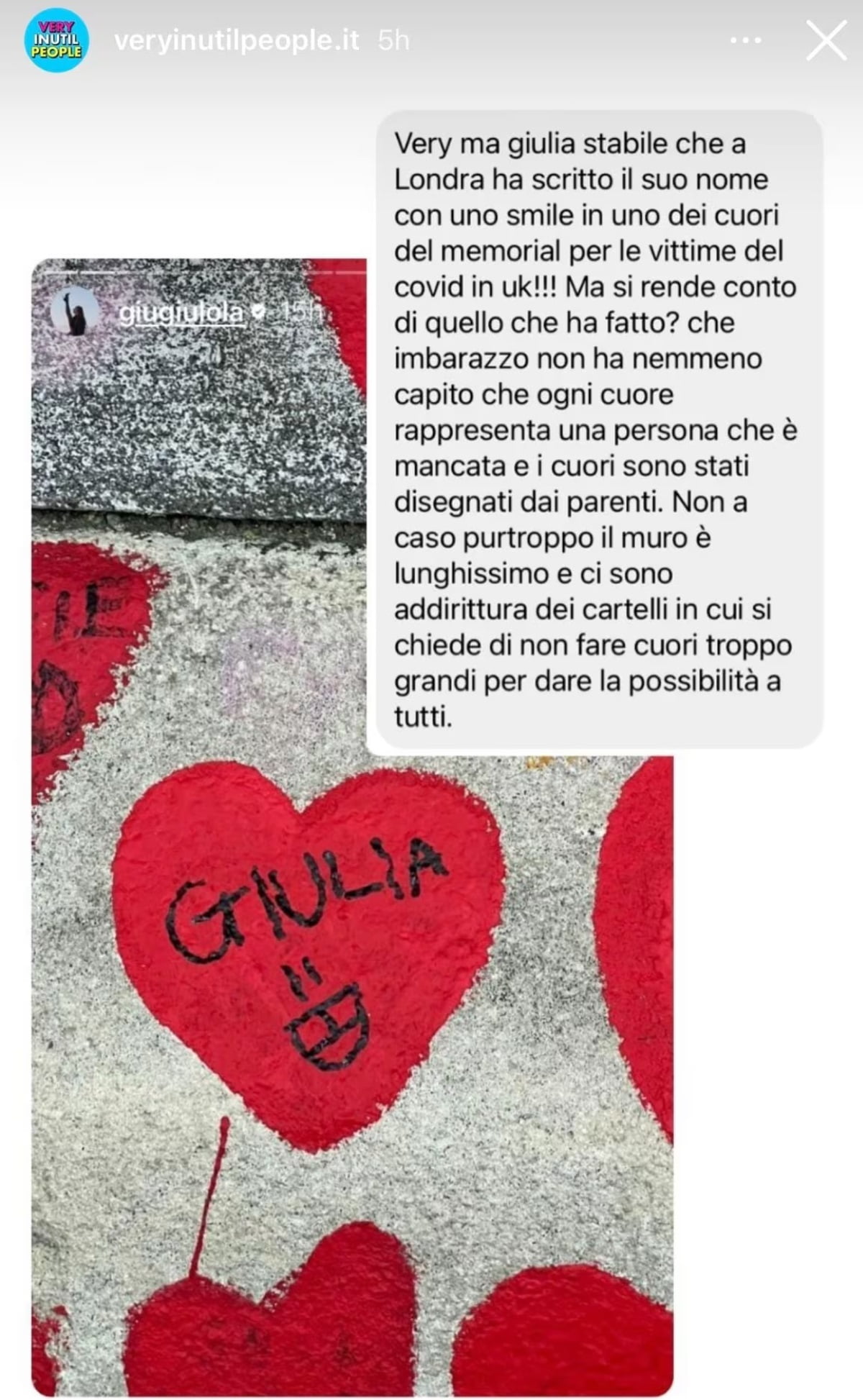 Attualmente a Londra per perfezionare la sua arte, Giulia Stabile ha incrociato un muro dedicato alle vittime del Covid. Notando che altre persone stavano scrivendo sui cuori che rappresentavano coloro che avevano perso la vita a causa della pandemia, Giulia ha voluto partecipare all’iniziativa e si è fatta prestare un pennarello. Senza rendersi conto del significato del muro, ha scritto il suo nome e ha aggiunto un sorriso, condividendo la foto su una storia di Instagram. Tuttavia, questa semplice azione ha avuto conseguenze inaspettate.