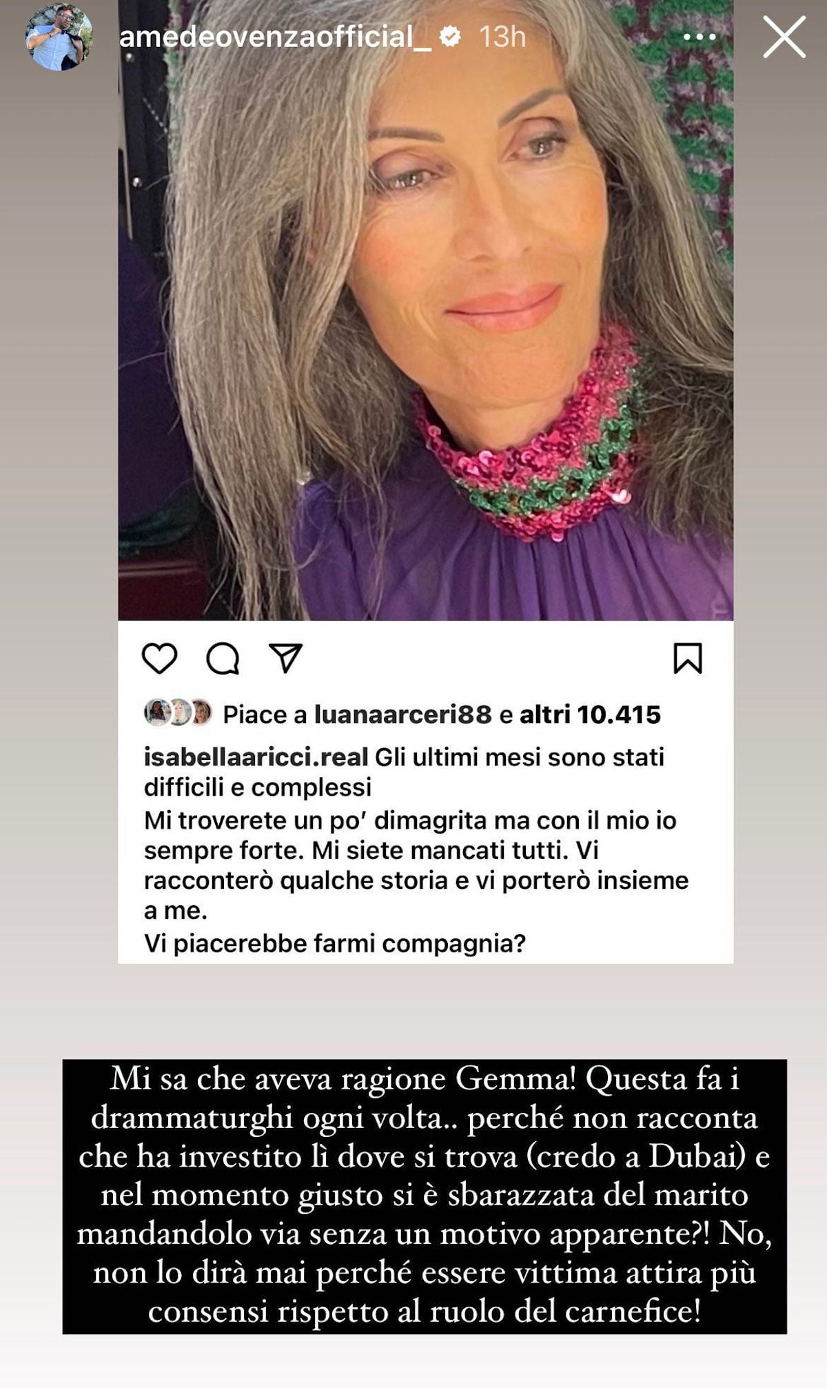 Tra i commenti al post di Isabella, spunta anche il nome di Amedeo Venza, esperto di gossip, che ha svelato un retroscena sconcertante sulla situazione. Secondo lui, Isabella avrebbe investito a Dubai e poi, nel momento opportuno, avrebbe abbandonato Fabio senza alcuna giustificazione apparente. Questa rivelazione ha sollevato diverse domande sulla verità dietro il divorzio e sulle reali motivazioni di Isabella.