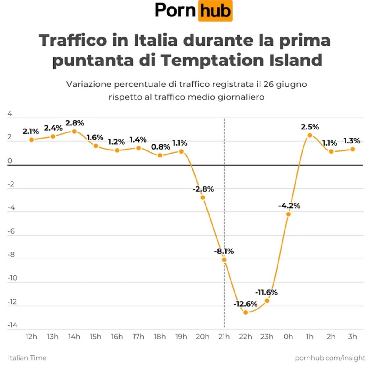 Ma le sorprese non finiscono qui. Proprio sul celebre sito per adulti, lunedì 26 giugno, le ricerche provenienti dall’Italia contenenti la parola “Temptation” sono aumentate del 721%. La situazione è rimasta pressoché invariata anche il giorno successivo, martedì 27, con un aumento delle visite relative a “Temptation” del 690% rispetto alla media. È evidente che esista una relazione tra la messa in onda di “Temptation Island” e il calo delle visite su Pornhub, poiché gli accessi hanno iniziato a diminuire proprio intorno alle 21:00, poco prima dell’inizio del reality.