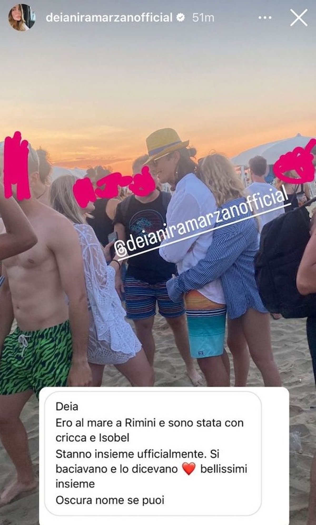 Deianira Marzano ha ricevuto una segnalazione da una follower che sostiene di averli visti insieme a Rimini, al mare. Nella foto allegata, Cricca e Isobel appaiono abbracciati e sembrano veramente felici insieme. “Ero a Rimini”, scrive l’autrice della segnalazione, “e ho trascorso del tempo con Cricca e Isobel. Sono insieme ufficialmente. Si abbracciavano e lo dicevano ❤️ sono bellissimi insieme”. Al momento, nessuno dei due ha rilasciato dichiarazioni, ma la foto e la testimonianza parlano da sole. Che ne pensate?