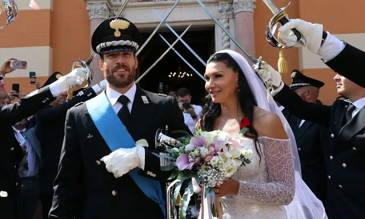 Luisa Corna ha scelto un elegante vestito bianco, camminando all’altare del braccio di sua madre. Stefano Giovino, ufficiale dei Carabinieri, ha indossato la sua uniforme ufficiale, con un picchetto d’onore a fare da cornice alla loro entrata.