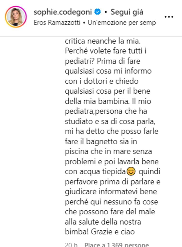 Sophie Codegoni ha prontamente risposto alla critica ricevuta, ribadendo che prima di prendere qualsiasi decisione riguardante sua figlia, si consulta sempre con il pediatra per garantire il suo benessere. Ha anche aggiunto che il suo pediatra, esperto in materia, ha approvato il bagno in piscina e al mare per la piccola Celine, indicando di lavarla accuratamente con acqua tiepida. Ha concluso invitando le persone a informarsi correttamente prima di giudicare, poiché nessuno farebbe mai nulla che potesse nuocere alla salute della loro bambina. La polemica è stata così chiusa sul nascere, sottolineando l’importanza di affidarsi alle competenze mediche e alla responsabilità genitoriale.
