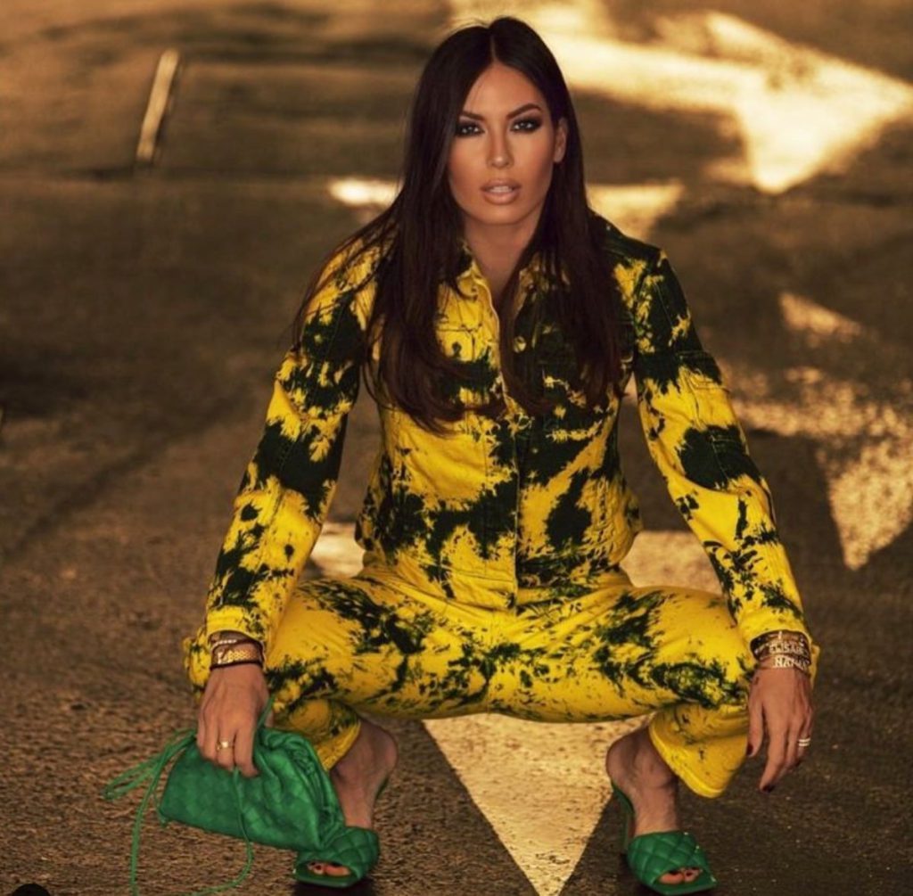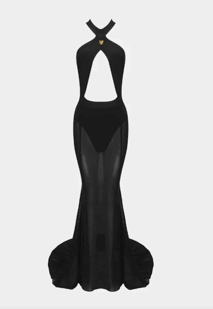 L’abito lungo e nero, caratterizzato da una generosa scollatura incrociata sia sul fronte che sul retro e da trasparenze sottili, porta la firma di Dan More, il celebre marchio di Daniele Morena amato dalle celebrità. Sul sito ufficiale, un modello simile, impreziosito da una testa di pantera in metallo e oro Swarovski, ha un costo di 1350 euro.