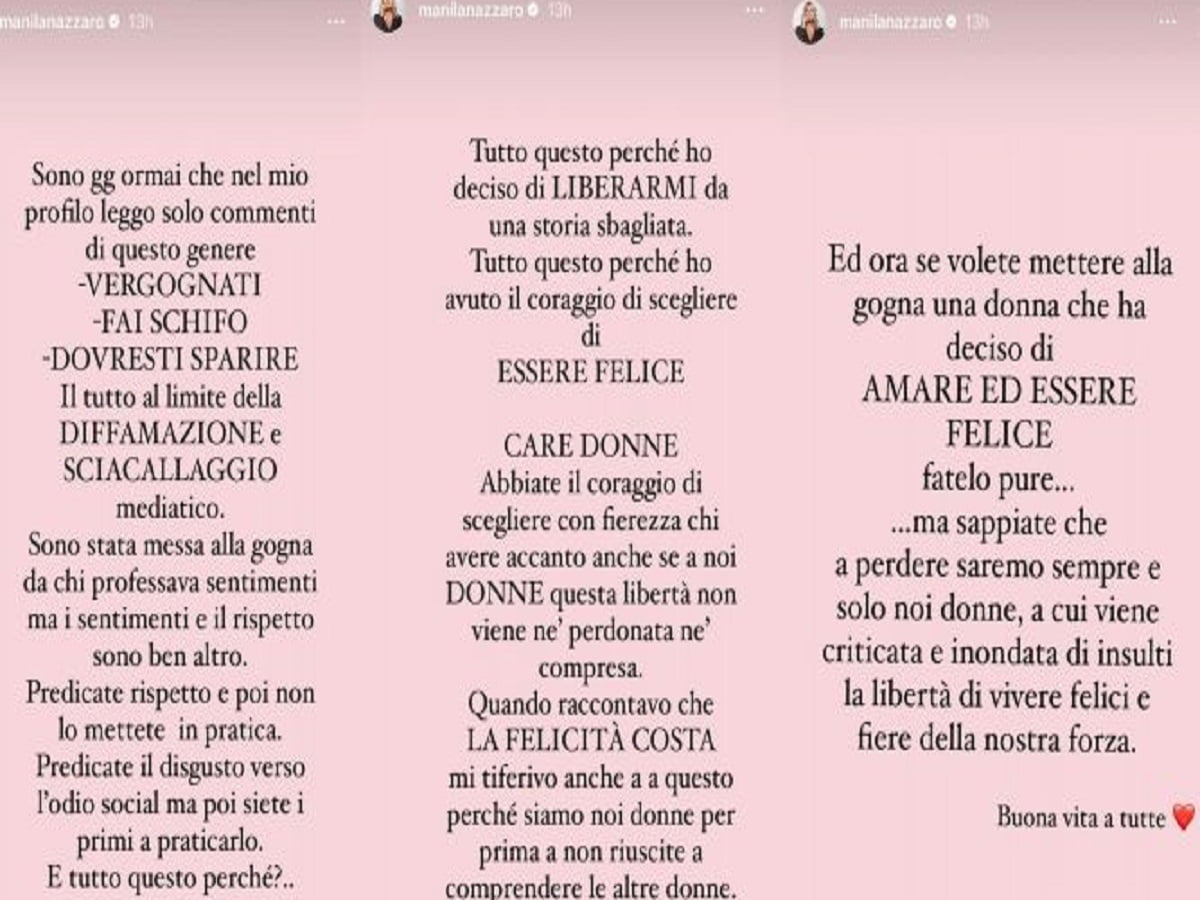Su Instagram, Manila Nazzaro pubblica un duro sfogo per affrontare le critiche e gli attacchi che ha subito. Sottolinea di aver letto commenti vergognosi, diffamatori e sciacallanti, provenienti anche da coloro che professavano sentimenti. Manila chiarisce che i sentimenti e il rispetto sono ben altro e critica l’ipocrisia di chi predica rispetto senza metterlo in pratica. Rende noto che ha deciso di liberarsi da una storia sbagliata e invita le donne a avere il coraggio di scegliere con fierezza chi avere accanto, nonostante la mancanza di comprensione e perdono nei confronti di questa libertà.
