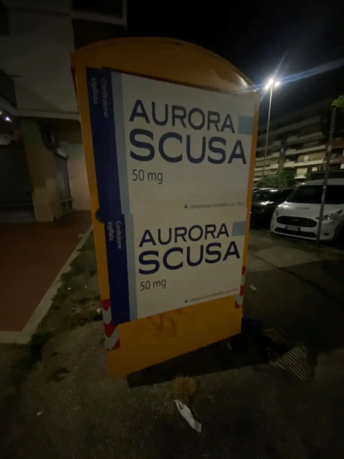 La pittoresca città di Ostia è stata oggetto di un evento insolito che sta incuriosendo e destando la curiosità dei suoi residenti. Da giorni, i cartelloni di scuse di Aurora sono sparsi ovunque: sui muri, ai lati dei cassonetti, persino sui cavalcavia. La scritta “Aurora scusa” campeggia su questi manifesti misteriosi, creando un’enigmatica confezione visiva che sembra ricordare un medicinale, con i suoi 50mg e quattro compresse rivestite con film.