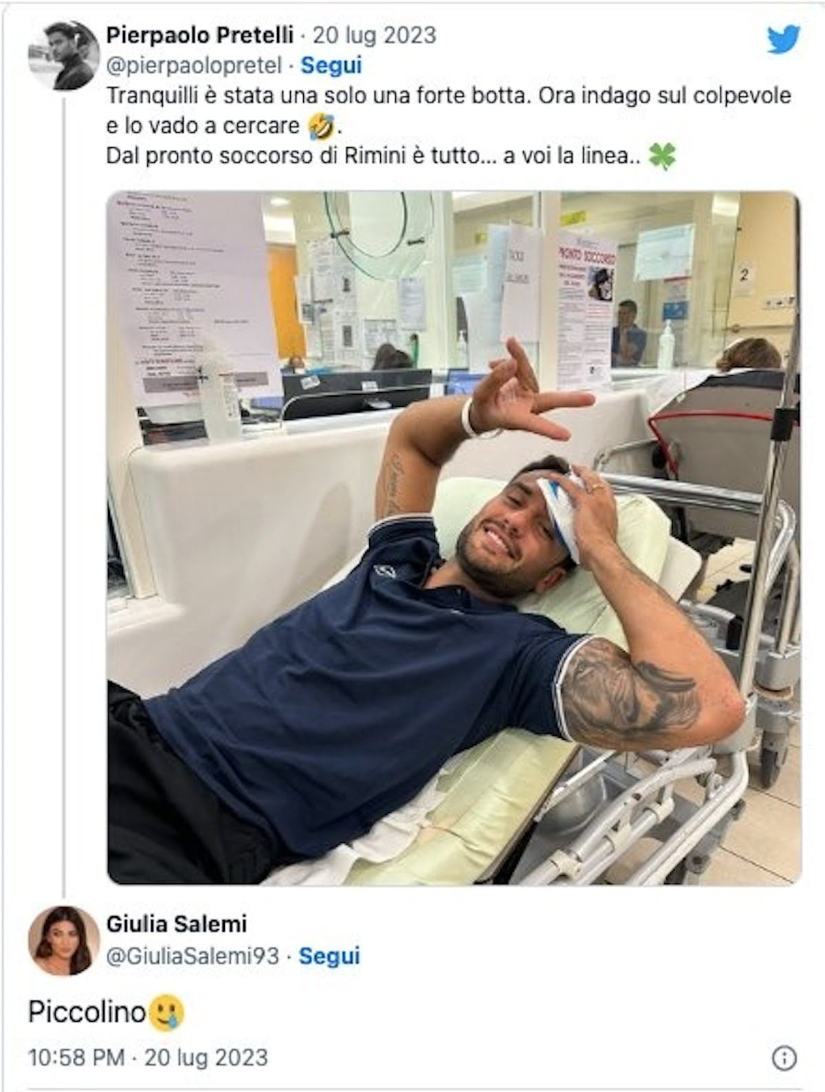 Il concorrente si è mostrato sorridendo in una foto dal pronto soccorso di Rimini, dove era sdraiato sul lettino con ghiaccio alla testa. Ha rassicurato i fan dichiarando che si trattava solo di una forte botta e ha scherzato sull’idea di cercare il “colpevole”. Giulia Salemi non è stata da meno, commentando affettuosamente “piccolino”. Successivamente, Pierpaolo ha fatto ritorno allo stadio e ha assicurato di stare meglio, confermando di essere pronto per tornare in campo.