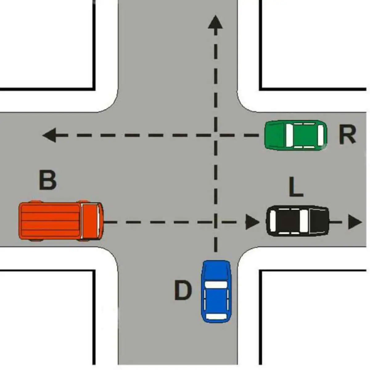 Con questo indizio fondamentale in mente, la sequenza diventa chiara: la macchina nera ha la precedenza, seguita dalla macchina verde, poi da quella blu e, infine, dal camion rosso.