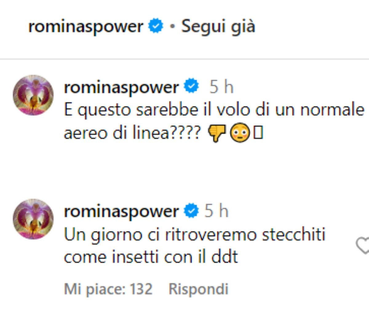 L’ex moglie di Albano Carrisi ha aggiunto: “Un giorno ci ritroveremo stecchiti come insetti con il DDT*”. Secondo Romina, queste sarebbero le presunte scie chimiche che causano problemi alle persone. Chi condivide le sue idee ha commentato: “*È una vergogna, se lo fai notare ti prendono per pazza*”, “*Purtroppo si guardano soltanto gli interessi di pochi e poi a parole vogliono salvare il mondo, ma nei fatti non cambia mai nulla”.