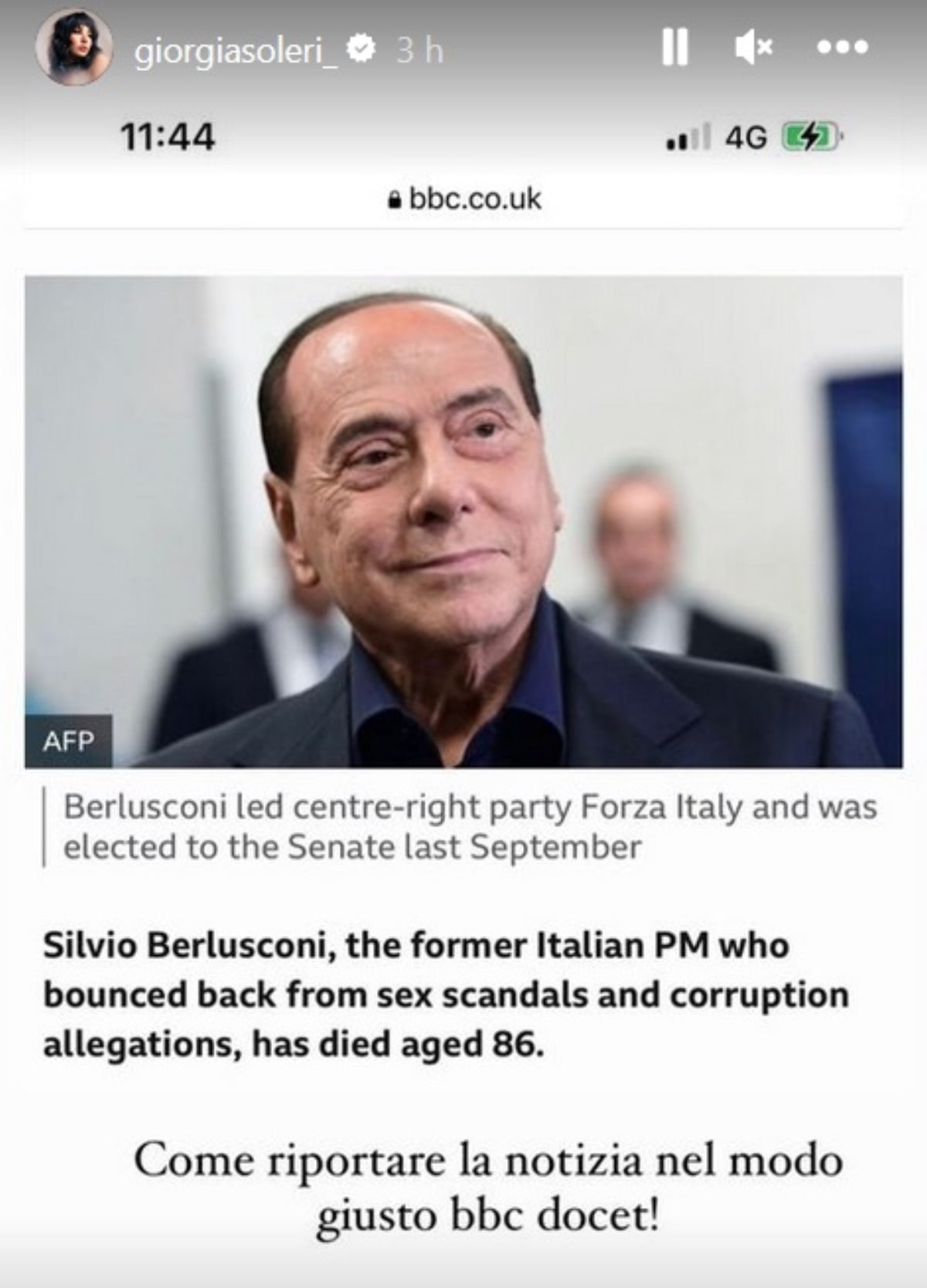 La storia successiva mostra un articolo della BBC che descrive Berlusconi come un ex Primo Ministro “colpito da scandali sessuali e accuse di corruzione”. Giorgia Soleri commenta approvando il modo in cui la BBC ha presentato la notizia.