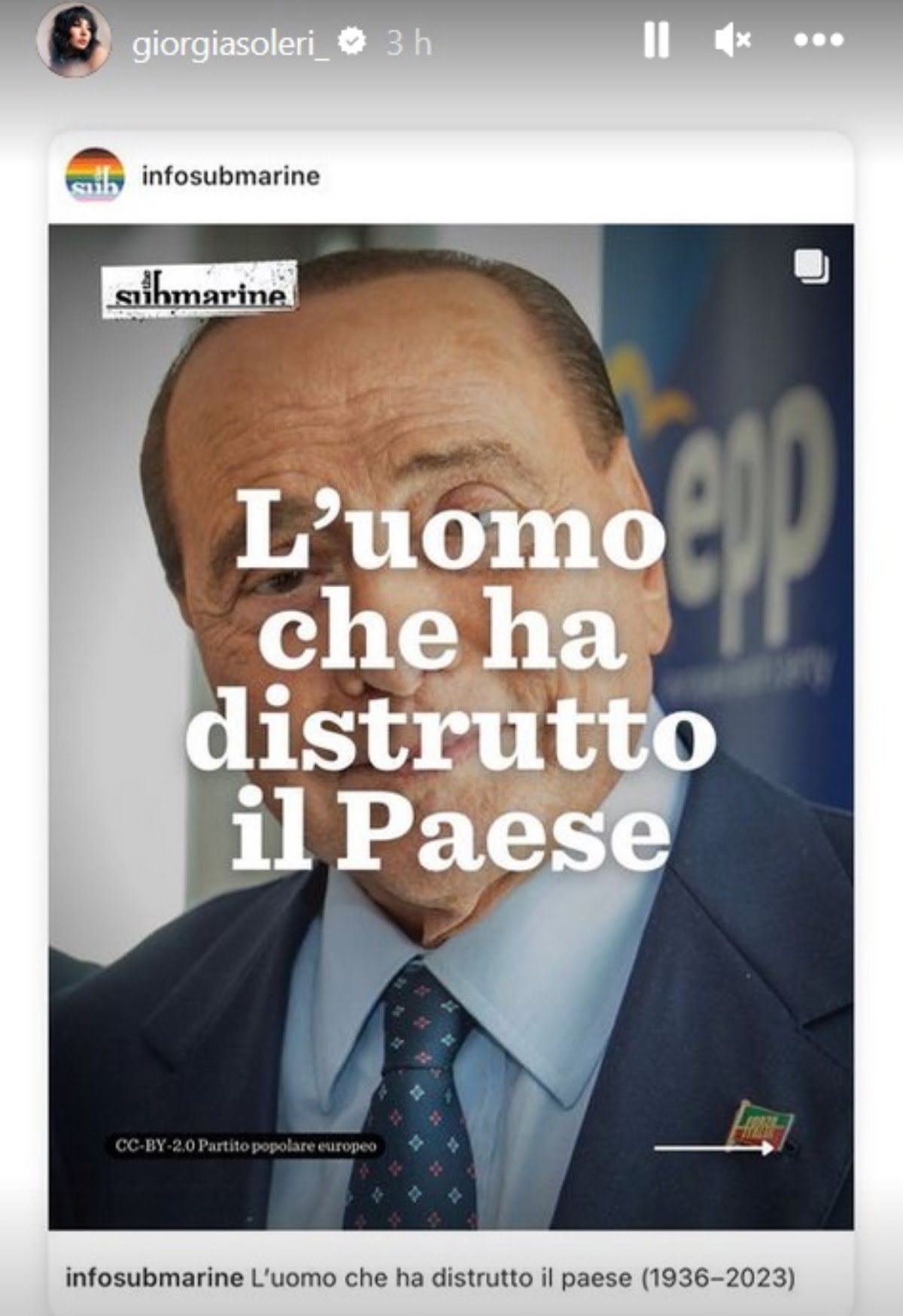 Sul suo profilo Instagram, ha pubblicato una serie di storie che gettano un’ombra critica sulla figura di Silvio Berlusconi. Una di queste storie mostra la copertina di un giornale online, The Submarine, con un’immagine di Berlusconi e un titolo che dichiara: “L’uomo che ha distrutto il Paese”.