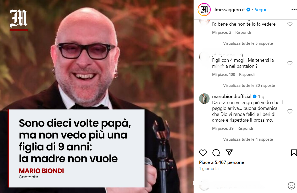L’intervista, condivisa su Instagram, ha scatenato un vivace dibattito tra i follower, con Biondi che ha risposto attivamente ai commenti, difendendo le sue scelte di vita. Tra supporto e critica, il cantante ha mantenuto una postura di apertura fino a quando non è stato costretto a interrompere il dialogo di fronte a commenti eccessivamente offensivi. “Da ora non vi leggo più,” ha concluso Biondi, evidenziando il desiderio di chiudere su una nota di positività: “Buona domenica, che Dio vi renda felici e liberi di amare e rispettare il prossimo.”