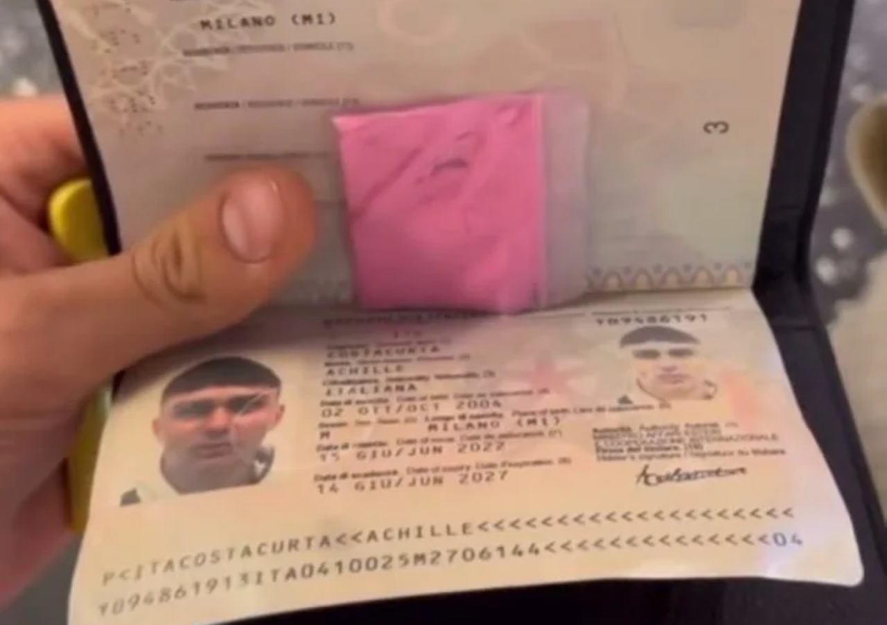 Nelle immagini condivise dal giovane, si vedono pacchi di denaro e bustine contenenti una polvere rosa che sembra essere una sostanza stupefacente. Inoltre, Achille mostra anche il suo passaporto, utilizzato per un viaggio negli Stati Uniti, con all’interno una di queste bustine.