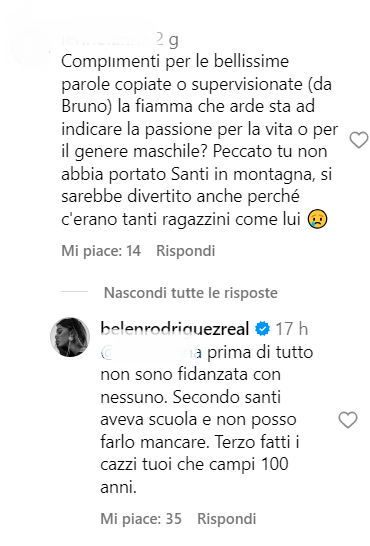 Un commento in particolare ha suscitato la reazione decisa della showgirl. Una follower ha infatti messo in discussione l’autenticità delle parole di Belen e ha fatto riferimento al figlio Santiago, suggerendo che avrebbe dovuto portarlo in montagna per divertirsi con altri bambini. La replica di Belen non si è fatta attendere: “Prima di tutto non sono fidanzata con nessuno. Secondo, Santi aveva scuola e non posso farlo mancare. Terzo fatti i cai tuoi che campi 100 anni”.** Questa risposta, seppur forte, sottolinea il desiderio di Belen di proteggere la sua vita privata e quella di suo figlio dalle speculazioni non richieste.