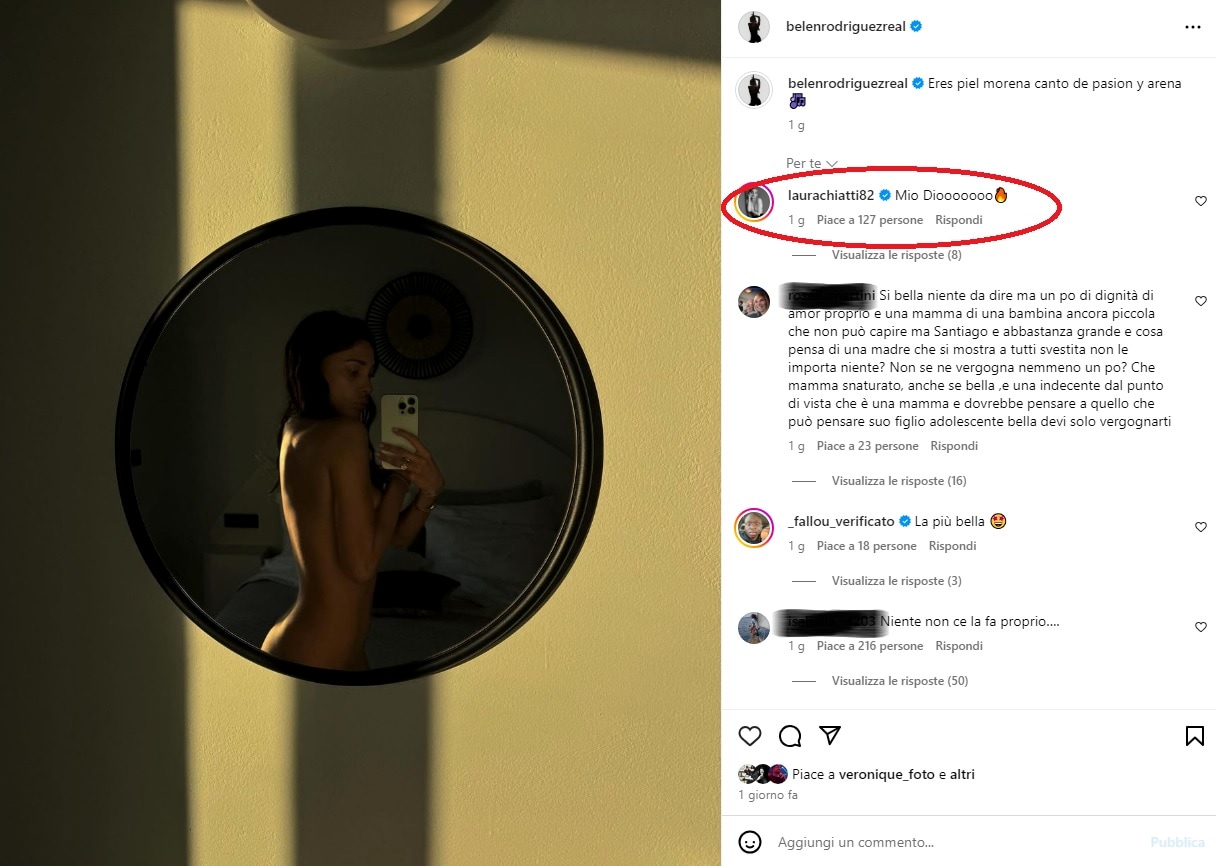La bellezza di Belen non è passata inosservata, come dimostrano i numerosi commenti ricevuti. Tra questi, spicca quello di Laura Chiatti, amica e frequentatrice assidua del profilo di Belen, che ha scritto “Mio Diooooo” con tanto di fiamma, contribuendo così ad alzare ulteriormente la temperatura.