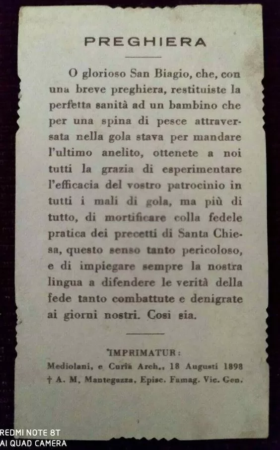 O glorioso San Biagio, che hai ottenuto da Dio la speciale grazia di guarire coloro che soffrono di malattie alla gola, guardaci con occhi di pietà e ottienici la grazia di una buona salute.