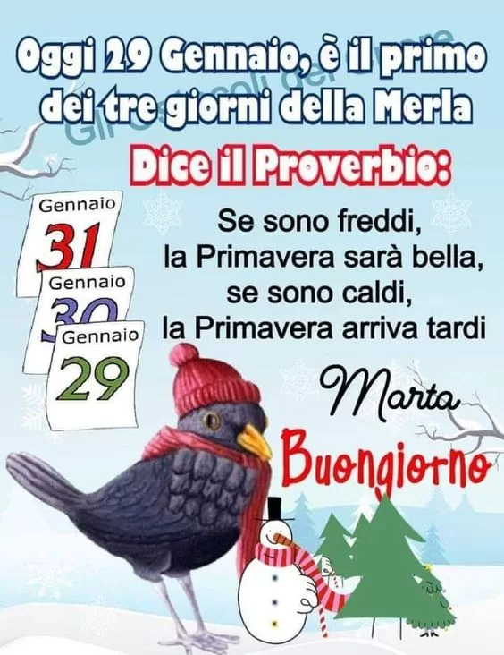 Un Saluto Riscaldante: “Buongiorno! Che questo secondo giorno della Merla sia avvolto dal tepore di pensieri affettuosi e sorrisi calorosi. Affronta la giornata con il cuore caldo e il passo leggero.”