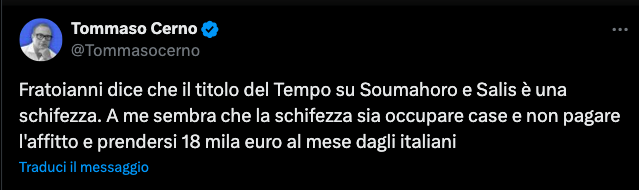A Fratoianni e a coloro che la pensano come lui, vogliamo garantire che noi – come quei cittadini di Monza che hanno esposto un cartello contro Salis – siamo consapevoli di aver toccato un nervo scoperto. Non ci facciamo intimidire dagli attacchi politici ai giornali. La nostra copertina, che lei ha definito una “schifezza”, rappresenta per milioni di italiani un Paese in cui una deputata con precedenti penali intasca 18mila euro netti al mese e si vanta di non pagare l’affitto della casa che ha occupato. In un Paese dove i salari sono bassi e le persone faticano ad arrivare a fine mese, questo è inaccettabile.