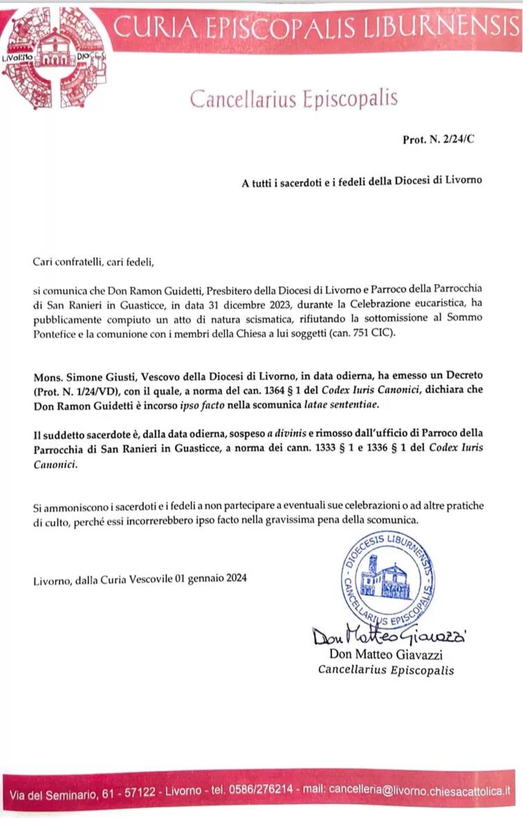 L’atto di scomunica, emesso dal cancelliere della diocesi, don Matteo Giavazzi, ha affermato che Guidetti “ha pubblicamente compiuto un atto di natura scismatica, rifiutando la sottomissione al Sommo Pontefice e la comunione con i membri della Chiesa a lui soggetti.” Di conseguenza, don Ramon Guidetti è stato dichiarato scomunicato “ipso facto,” il che significa che è stato sospeso da tutte le funzioni clericali e rimosso dall’ufficio di parroco. I fedeli sono stati anche avvertiti di non partecipare a eventuali celebrazioni o pratiche di culto condotte da Guidetti, poiché anch’essi potrebbero incorrere nella grave pena della scomunica.