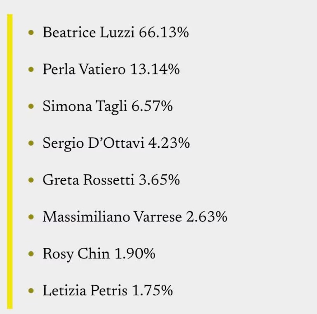 Beatrice Luzzi ha dimostrato una straordinaria resilienza, emergendo immune in ben 111 nomination e raccogliendo oltre il 60% delle preferenze del pubblico nelle settimane precedenti, guadagnandosi il titolo di prima finalista. Rosy Chin, dopo uno scontro diretto con Letizia Petris, ha raggiunto la finale insieme a Massimiliano Varrese, Perla Vatiero e Simona Tagli. Questa sera, gli ultimi due finalisti verranno nominati.