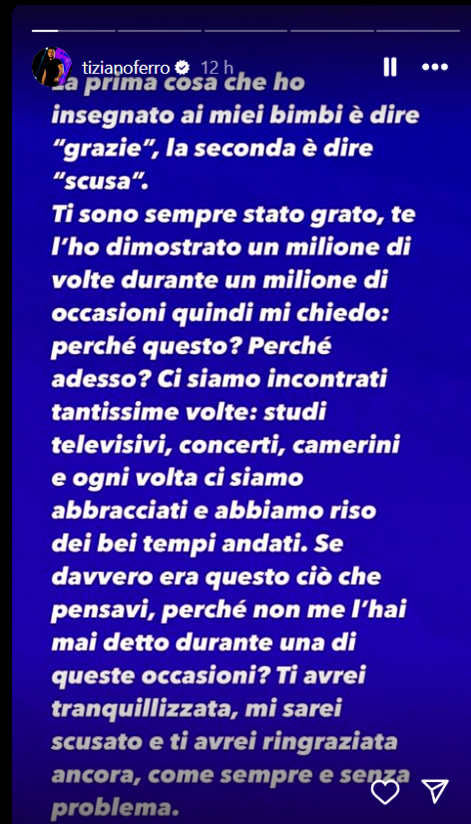 Questa vicenda evidenzia l’importanza della comunicazione e del riconoscimento reciproco nelle relazioni professionali, soprattutto in un’industria così pubblica e intensa come quella musicale. Ferro, con il suo messaggio, non solo cerca di chiarire la sua posizione ma invita anche a una riflessione più ampia sulle dinamiche umane e professionali che definiscono le carriere nel tempo.