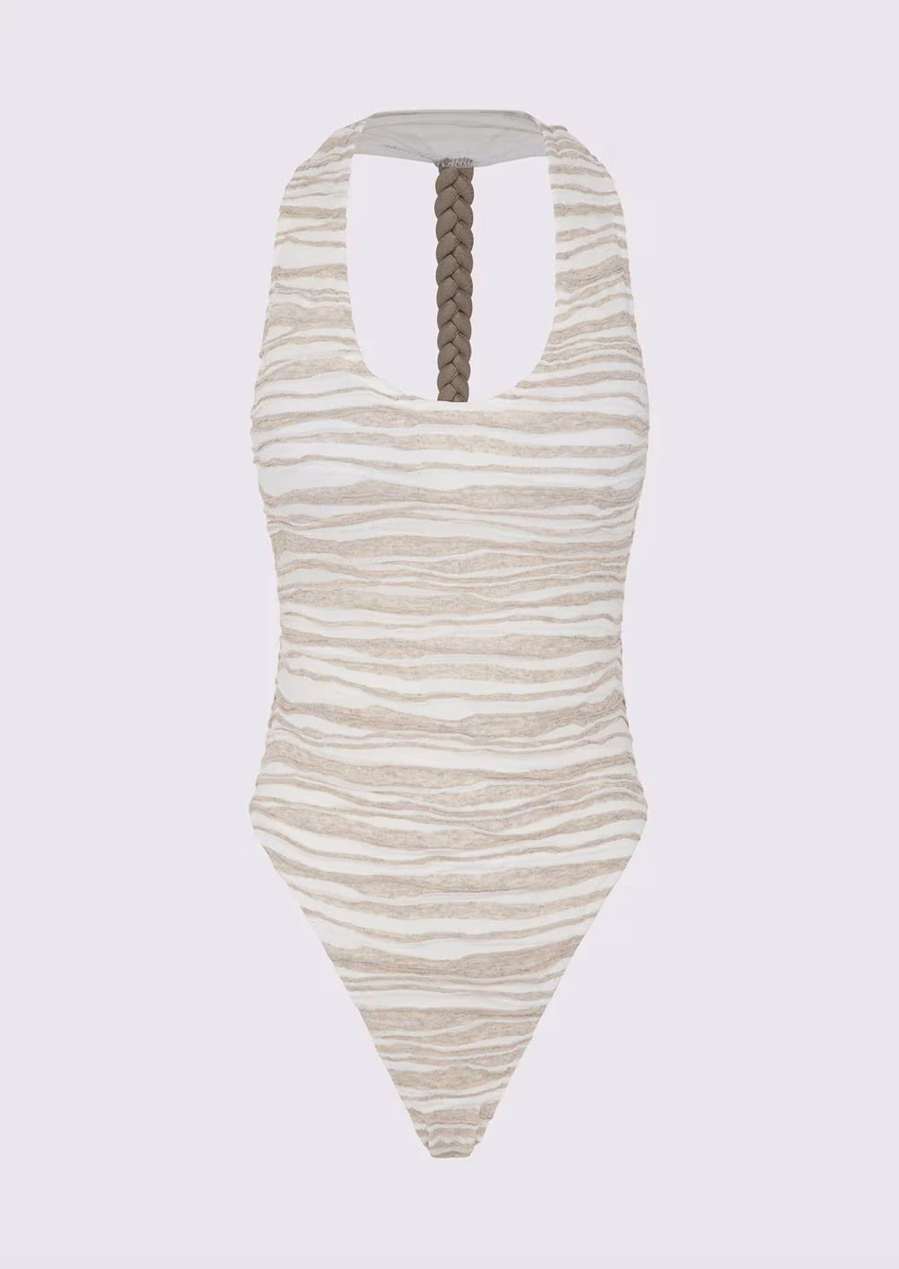Il costume Me Fui che Belén indossa è un modello intero, estremamente sgambato e fasciante, caratterizzato da una maxi scollatura sulla schiena che ne accentua la silhouette. Il dettaglio più distintivo è una treccia di tessuto che adorna elegantemente la schiena, partendo dalla nuca fino al fondoschiena. Questo design non solo esalta la figura, ma aggiunge un tocco di classe e originalità al look da spiaggia.