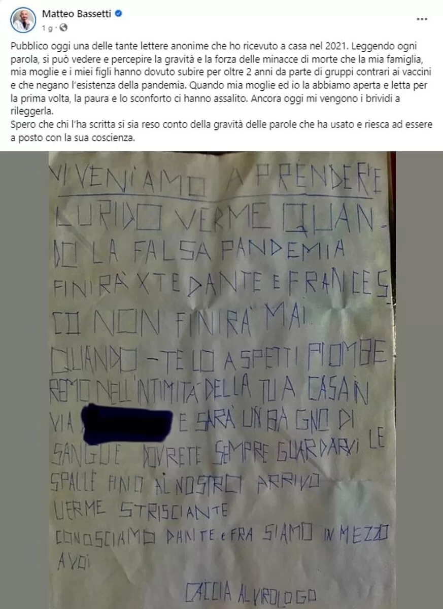 Durante il tumulto della pandemia da COVID-19, numerosi esperti del settore della virologia e della sanità hanno affrontato una crescente ostilità da parte di gruppi di opposizione, inclusi i no vax e coloro che negavano l’esistenza stessa del virus. Tra le vittime di questa crescente aggressione, il dottor Matteo Bassetti, direttore della Clinica di Malattie Infettive del Policlinico San Martino di Genova, è emerso come uno degli esperti più bersagliati. Su Facebook, ha condiviso una delle lettere anonime minatorie ricevute nel 2021, che non prendeva di mira solo lui ma coinvolgeva anche i suoi figli adolescenti.