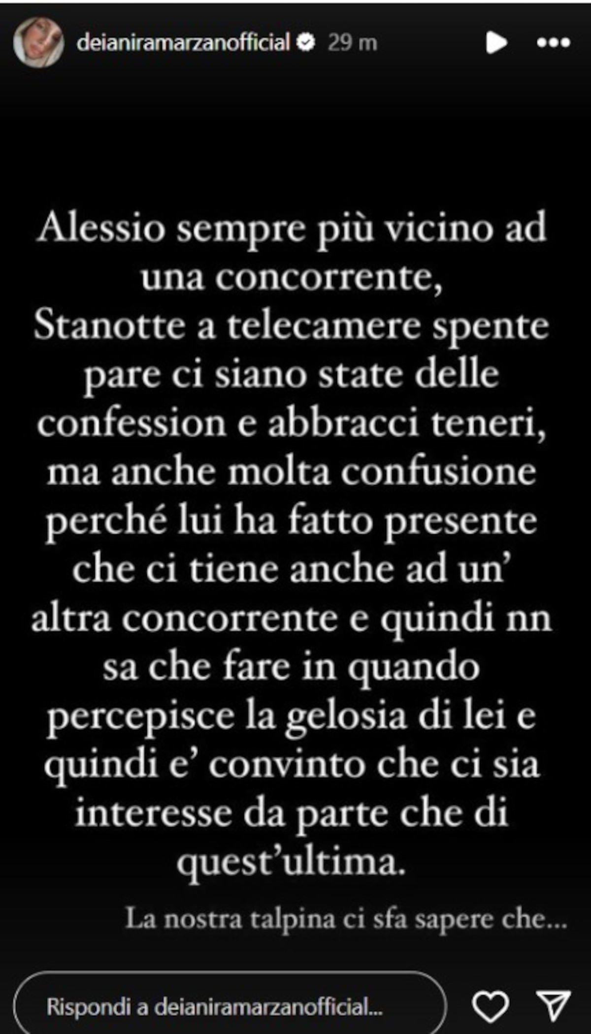 La notizia esplosiva è stata sganciata da Deianira Marzano, tramite il suo profilo Instagram. Secondo la sua fonte, Alessio avrebbe avuto delle confessioni e degli abbracci teneri con un’altra concorrente durante la notte, mentre le telecamere erano spente. Questo ha scatenato molta confusione e ha messo in luce il dilemma del giovane, indeciso tra il legame con una concorrente e la presunta gelosia di un’altra.