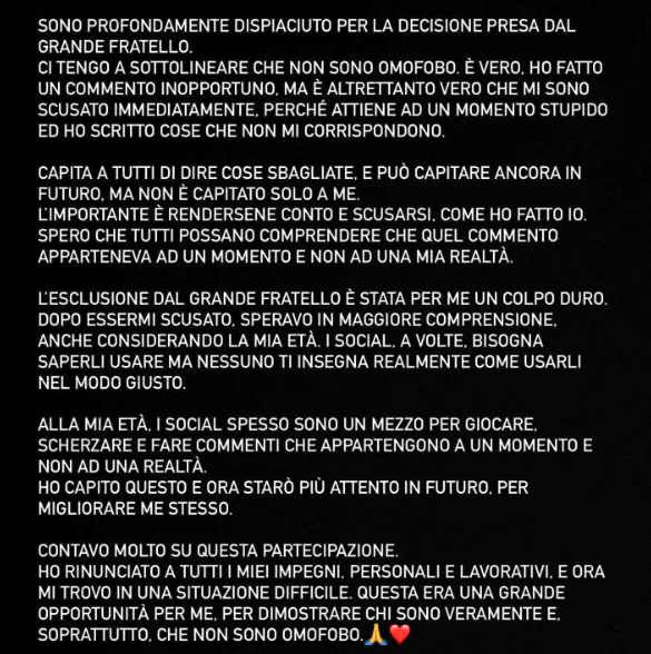 Solo poche ore dopo, Lino ha risposto su Instagram, dicendo di sentirsi profondamente dispiaciuto per la decisione. Ha voluto ribadire chiaramente: “Non sono omofobo. È vero, ho scritto un commento inappropriato, ma mi sono subito scusato poiché quel messaggio non rappresenta chi sono. A tutti può capitare di esprimere pensieri poco ponderati, e quello è stato un momento di debolezza. L’importante è prendere coscienza dei propri errori e chiedere scusa, come ho fatto io.”